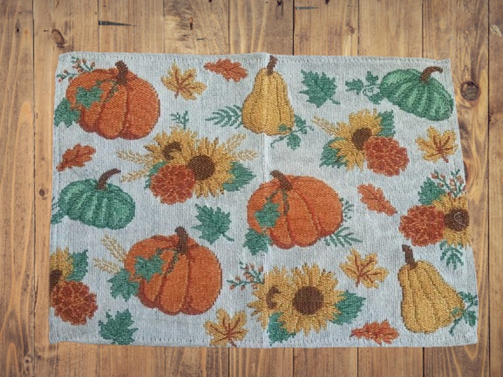 You will receive 3 " Autumn Leaves" and 2 pumpkin placemats.Size : 13" x 18"64% Cotton / 36% PolyesterSpot Clean... Read more
